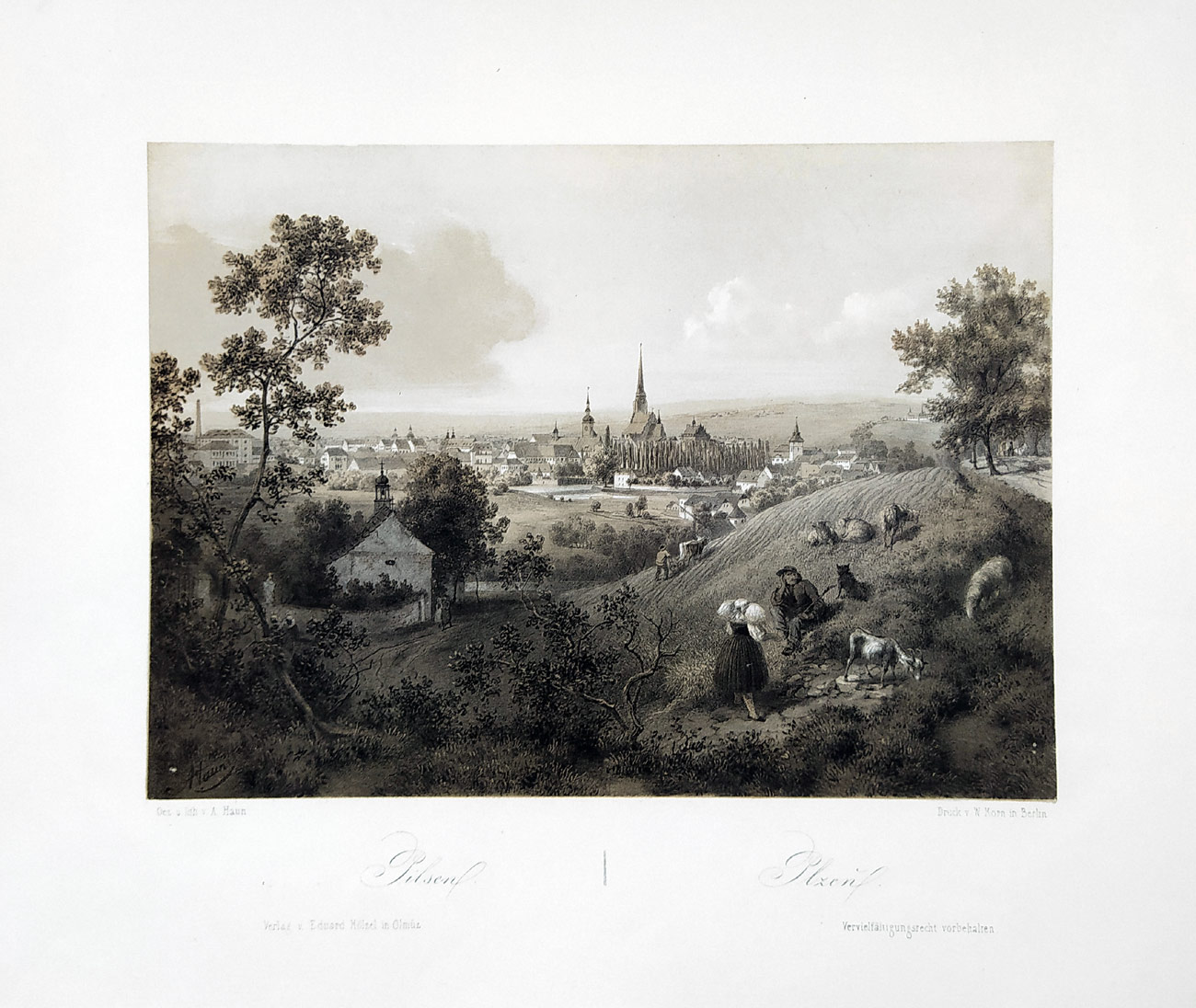 Plzeň – Haun August, původní dvoubarevná litografie s podtiskem, 1860. Původní dvoubarevná litografie s podtiskem. Podle vlastní kresby litografoval August Haun. Pod vyobrazením dvojjazyčný název listu: Pilsen. | Plzeň. Vytiskl W. Korn v Berlíně, nakladatel Eduard Hölzel v Olomouci.