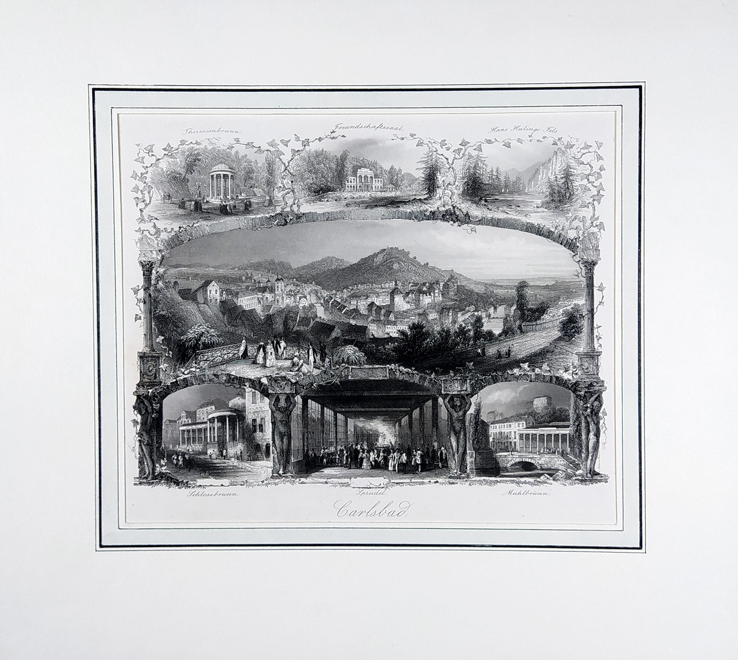 Karlovy Vary – „Carlsbad.“. Upomínkový list, Albert Henry Payne, původní oceloryt, 1850. Celkový pohled na město obklopený šesti detaily (Theresienbrunnen, Freundschaftssaal, Hans Heilinger Fels, Mühlbrunn, Sprudel u. Schlossbrunn).