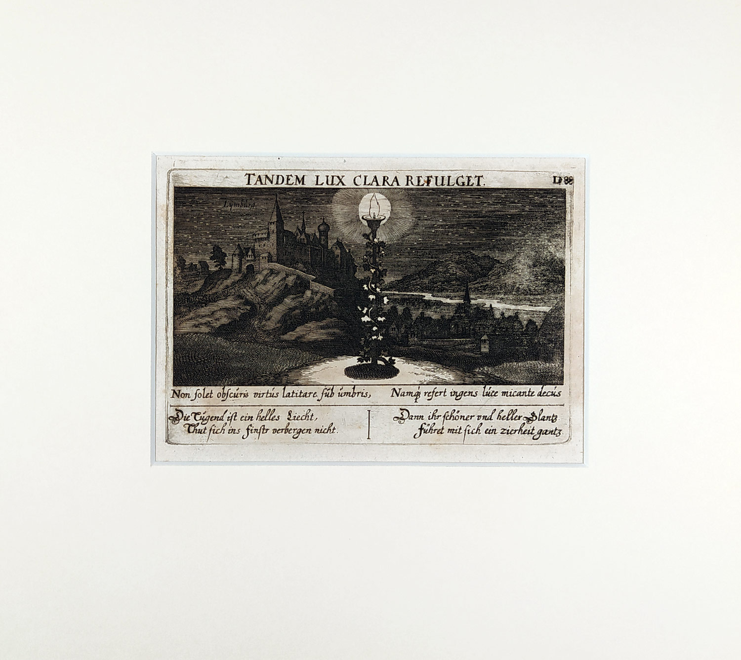 Mikulov – Meissner Daniel, původní mědiryt, veduta, 1678. „TANDEM LUX CLARA REFULGET.“. Původní mědiryt, Daniel Meissner z díla „Sciagraphia Cosmica, Oder ...“ Vydal Paul Fürstens v Norimberku, 1678. Celkový pohled na město Mikulov. Celkový rozměr v paspartě: 24,7 cm × 27,6 cm.