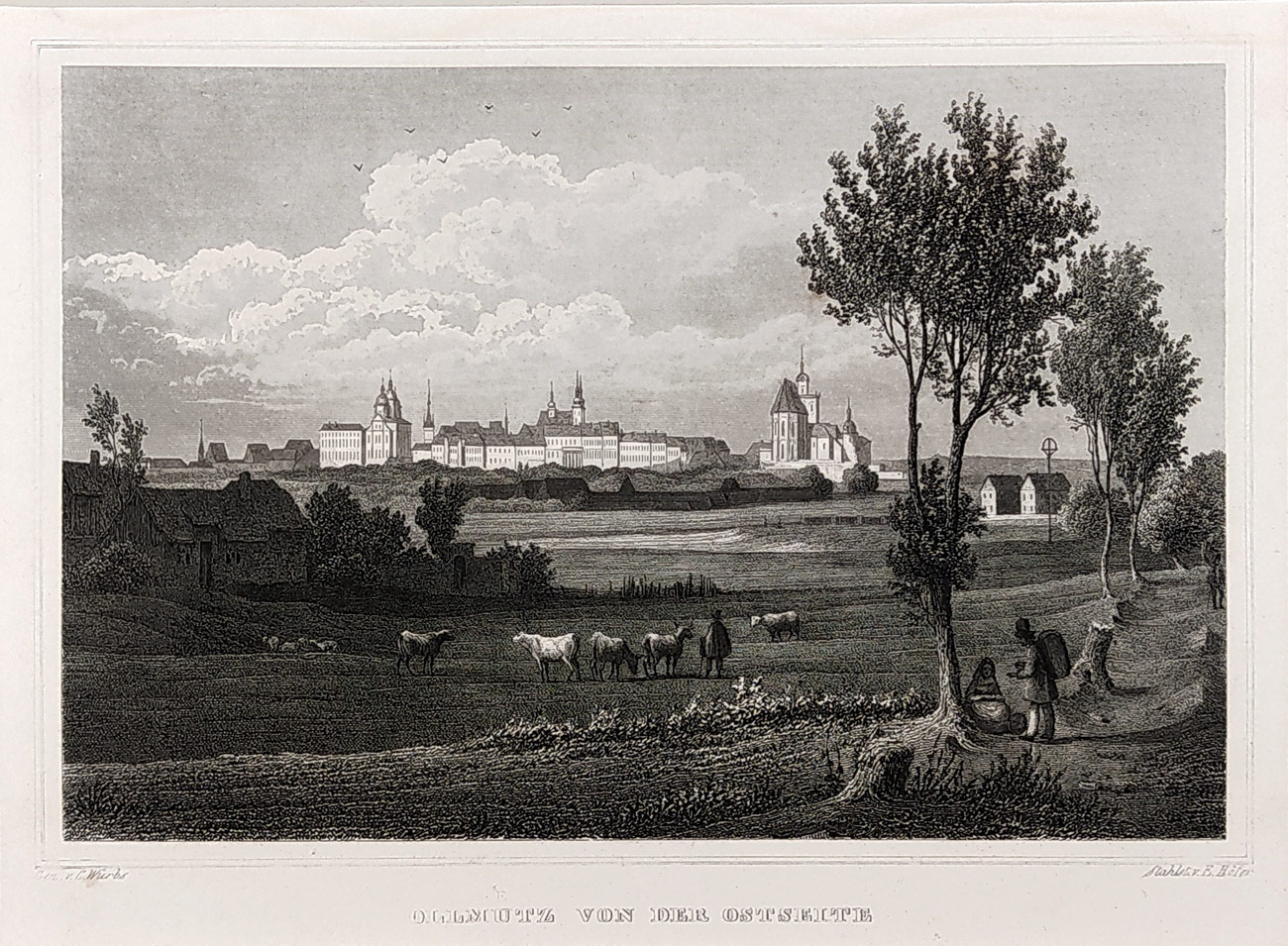 Olomouc – pohled na město, C. Würbs, E. Höfer, původní oceloryt, ca 1840. Pod vyobrazením název listu: „Olmütz von der Ostseite“. Celkový rozměr v paspartě: 24,4 cm × 28,2 cm.