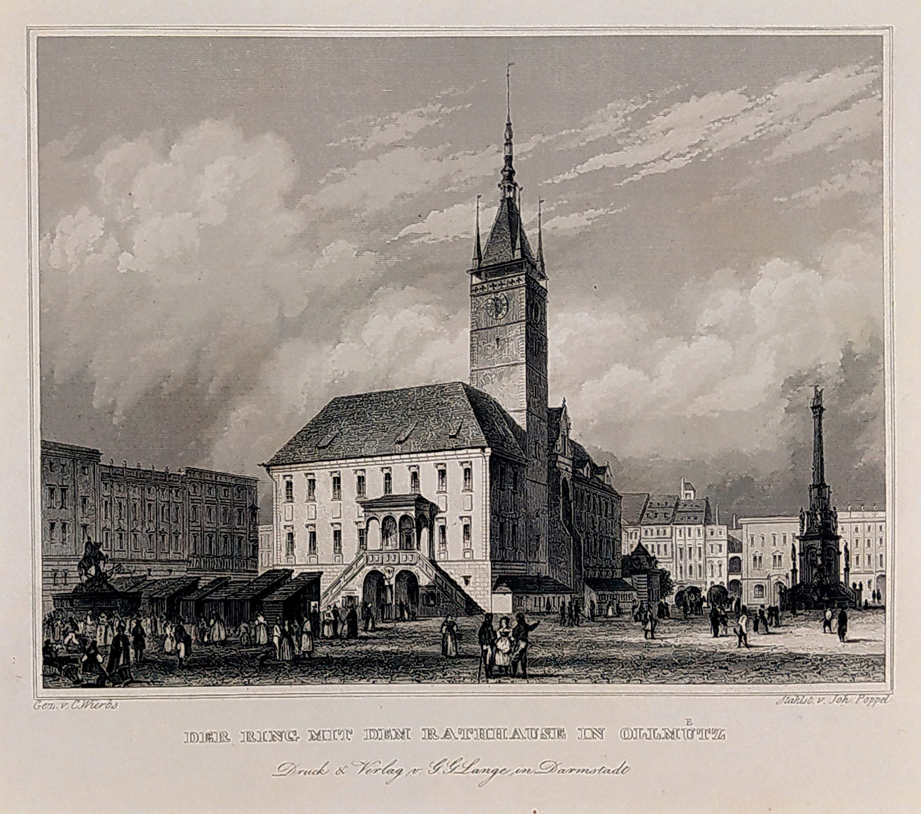 Olomouc – „Der Ring mit dem Rathause in Ollmütz“, Carl Würbs, Poppel Johann, původní oceloryt, 1845. Podle kresby Carla Würbse vyryl Johann Poppel. Vydal: Vydal Ludwig Lange v Darmstadtu.