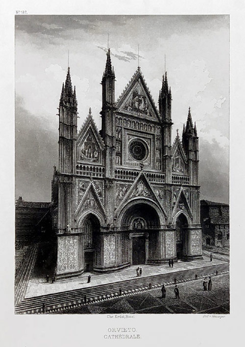 Orvieto – Katedrála Nanebevzetí Panny Marie, Heisinger, původní oceloryt, ca 1840. Pod vyobrazením název listu: „Orvieto Cathédrale“. Vytiskl a vydal: Chr. Krüsi v Basileji. Celkový rozměr v paspartě: 33,5 cm × 27,7 cm.