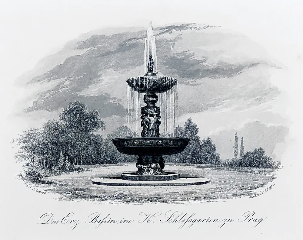 Praha – Zpívající fontána, původní oceloryt, 1841. Podle kresby Ludwiga Langeho vyryl Johann Poppel. Pod vyobrazením název listu: „Das Erz Bassin im K. Schlossgarten zu Prag“. Celkový rozměr v paspartě 24,7 cm × 26,1 cm.