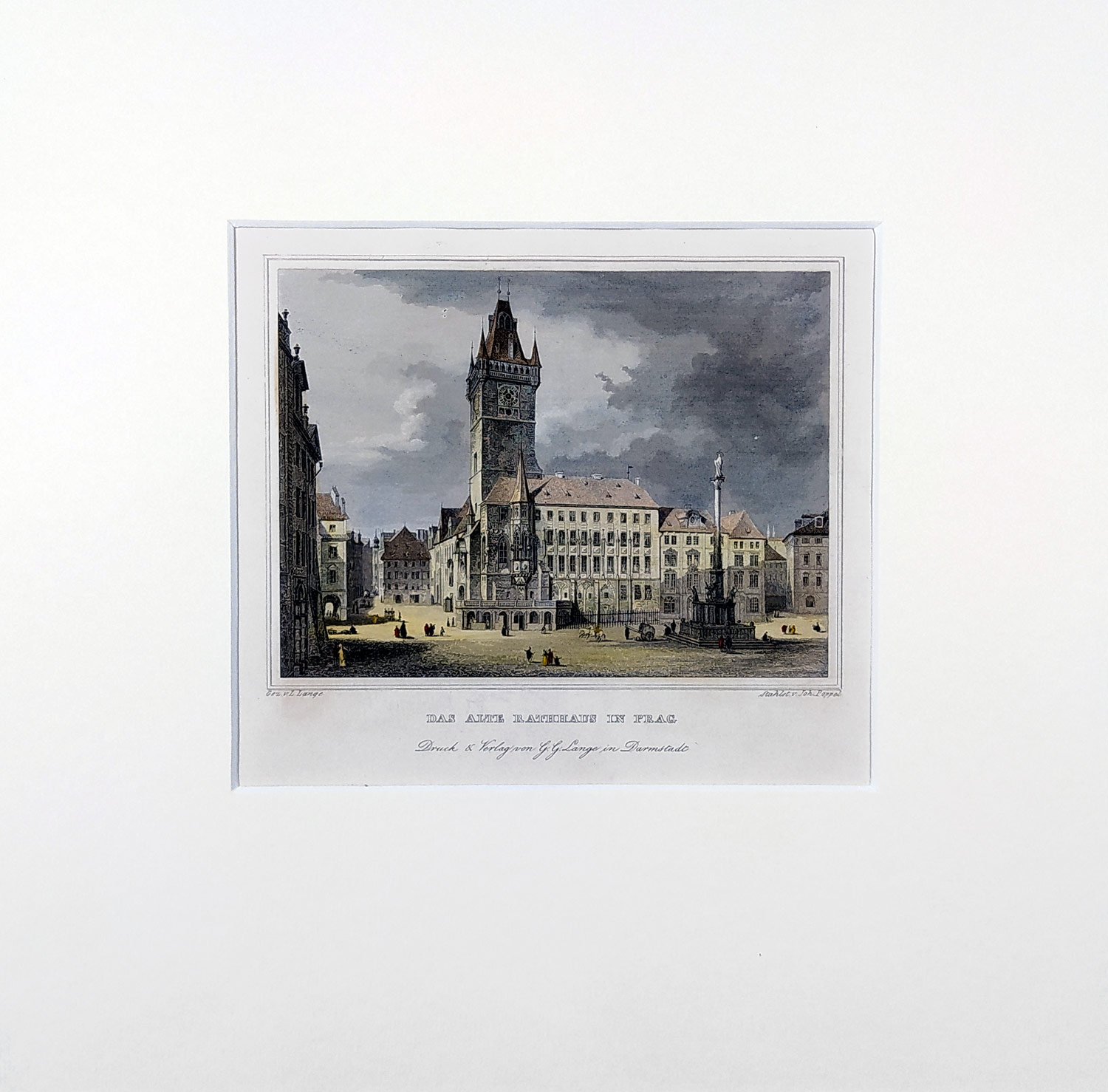 Praha – Staroměstská radnice. Název listu uveden od vyobrazením: „Das Alte Rathaus in Prag“. Kolorovaný původní oceloryt, podle L. Langeho kresby ryl Joh. Poppel. Vydal G. G. Lange v Darmstadtu, ca 1840.