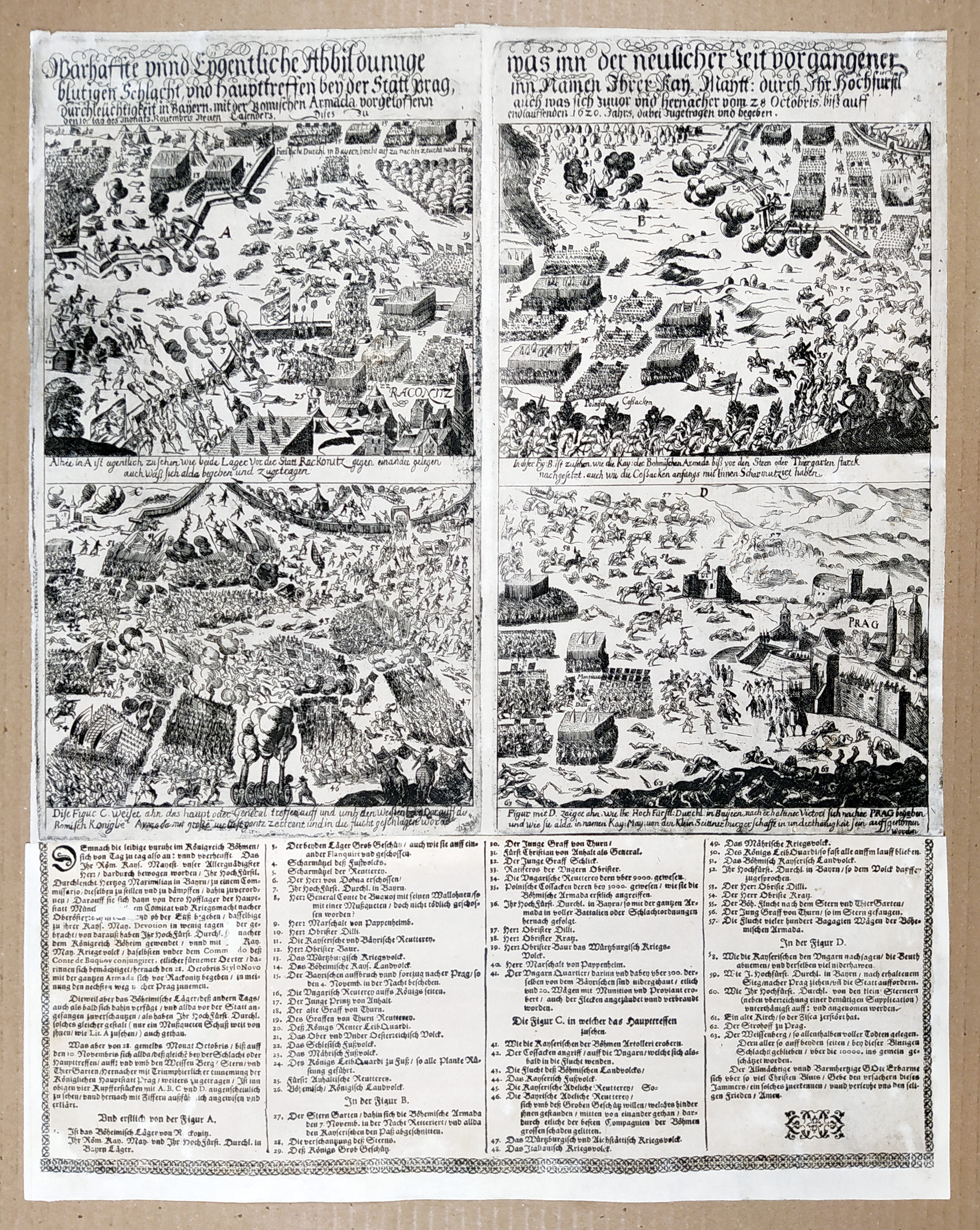 Praha – Bitva na Bílé hoře, Einblattdruck, předleptaný mědiryt, ca 1620. Hlavní název listu: „Warhaffte unnd Eygentliche Abbildunnge was inn der neulicher zeit vorgangener blutigen Schlacht, und Haupttreffen bey der Statt prag, inn Namen Ihrer Kay. Maytt: durch Ihr Hochfürstl. Durchleuchtigkeit in Bayern, mit der Bohmischen Armada vorgeloffenn auch was sich zuuor und hernacher vom 28 Octobris. bis auff den 10. tag des Monats Novembris Neuen Calenders, Dises zu endlauffenden 1620. Jahrs, dabei zugetragen und begeben.“. 4 vyobrazení události. Hlavní název i legenda pod vyobrazením v němčině. Výpravná legenda 1.–63. Z díla: Paas, John Roger: The German Political Broadsheet (1600–1700).