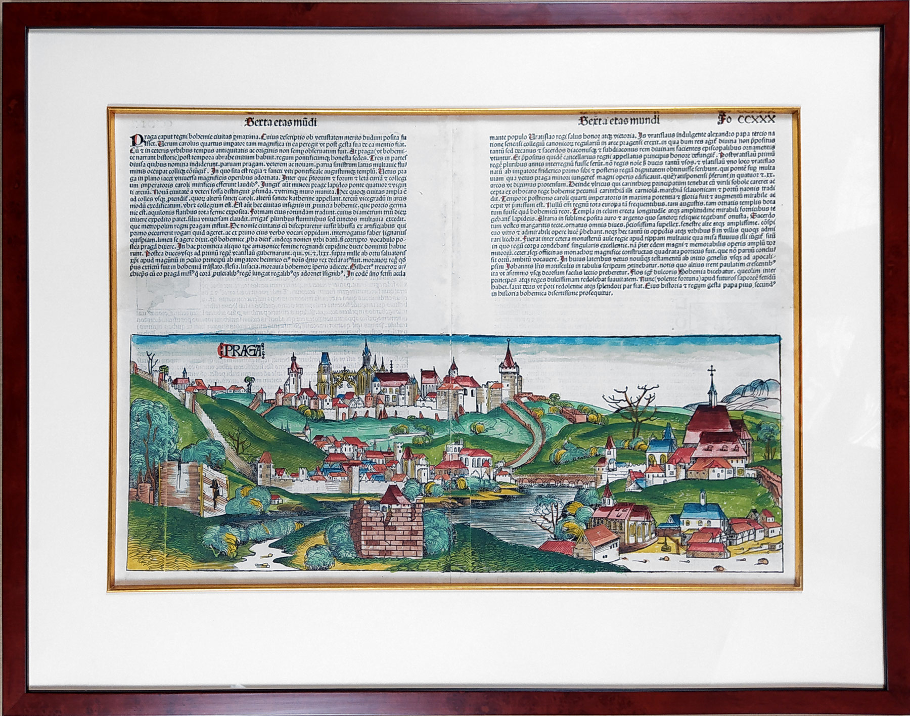 Praha – PRAGA, Schedel Hartmann, původní dřevořez 1493. Jedná se o první grafické vyobrazení města Prahy. Pohled od Vyšehradu na Pražský hrad, Malou Stranu s Karlovým mostem a část Nového Města. Dřevořez z díla: Hartmann Schedel, Liber chronicarum (229-230) vydali Sebastian Schreyer a Sebastian Kamermeistr v Norimberku r. 1493. Celkový rozměr v paspartě a rámu: 56,7 cm × 72,44 cm.