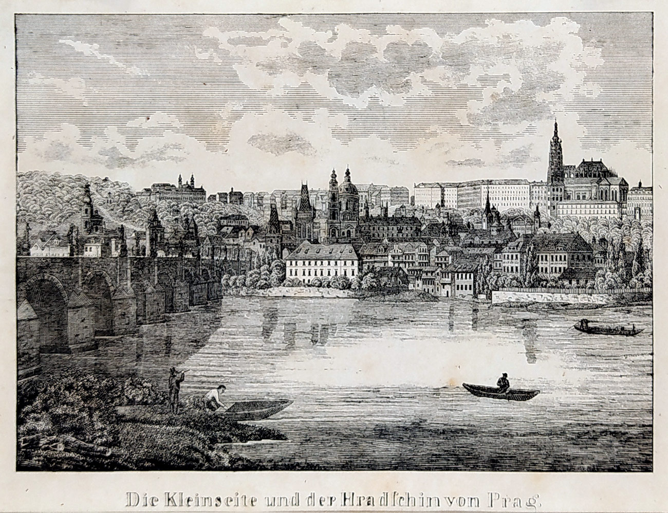 Praha – pohled přes řeku na Malou Stranu a Hradčany, původní dřevoryt, ca 1860. Název listu: „Die Kleinseite und der Hradschin von Prag.“