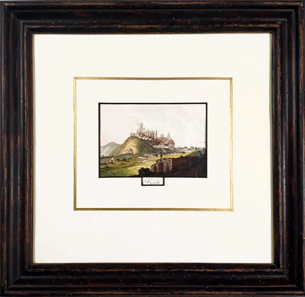 Rábí – A. Pucherna, A. G. Meissner, kolorovaný obrysový lept, 1798. Podle kresby Fr. K. Wolfa leptal A. Pucherna. Celkový rozměr v rámu: 51,0 cm × 53,0 cm.
