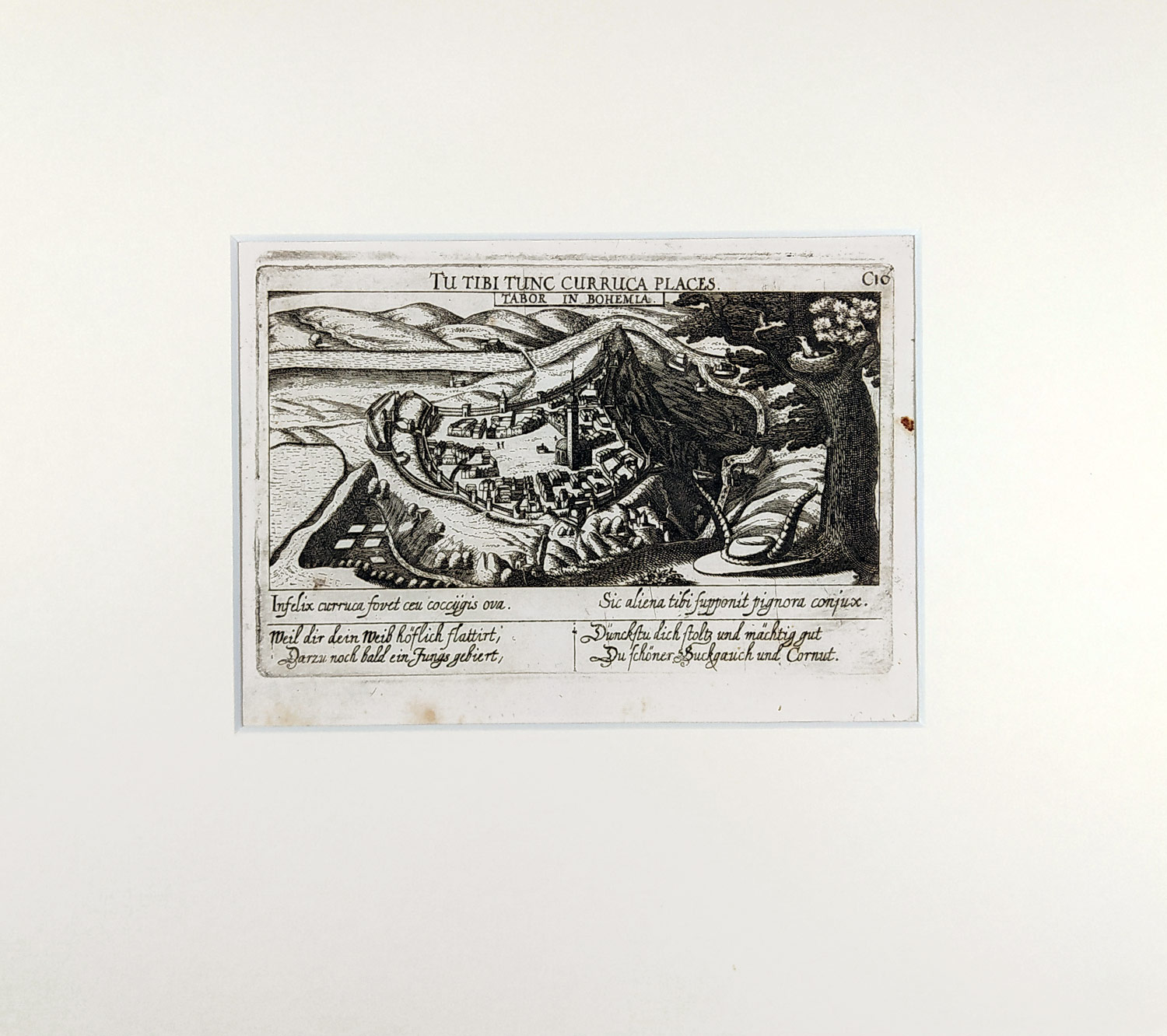 Tábor. „TABOR IN BOHEMIA“. Původní mědiryt, Daniel Meissner z díla „Sciagraphia Cosmica, Oder ...“ Vydal Paul Fürstens v Norimberku, 1678. Celkový pohled na město Tábor s alegorickým výjevem v popředí a veršovaným úslovím pod vyobrazením. Celkový rozměr v paspartě: 25,0 cm × 27,8 cm.