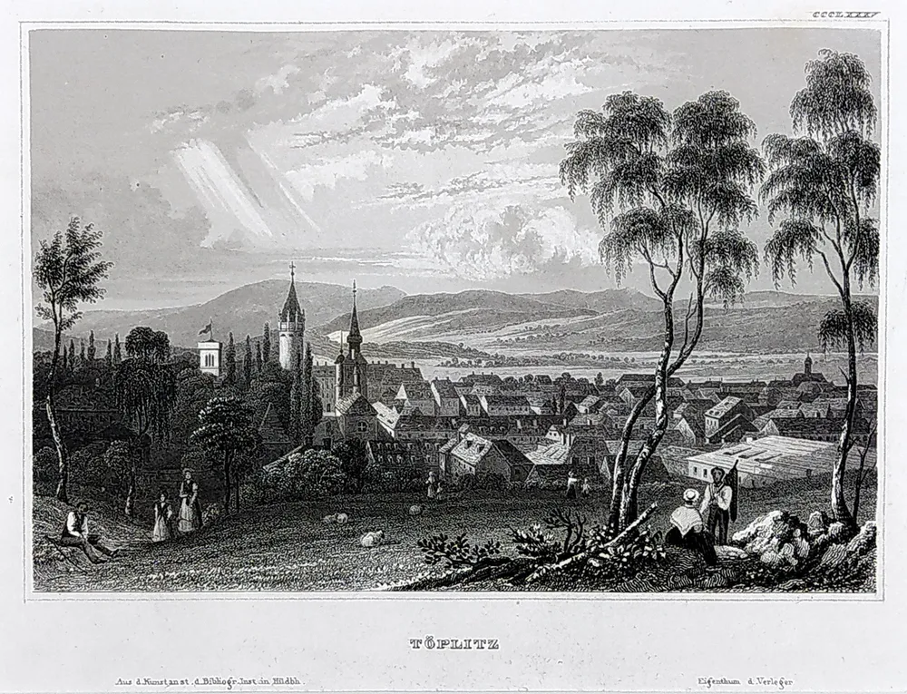 Teplice – pohled na město. Původní oceloryt z Meyer's Universum. Vyd. Bibliograph. Institut, Hildburghausen, cca 1840. Pod vyobrazením název listu: „Töplitz“. Celkový rozměr v paspartě: 25,7 cm × 27,8 cm.
