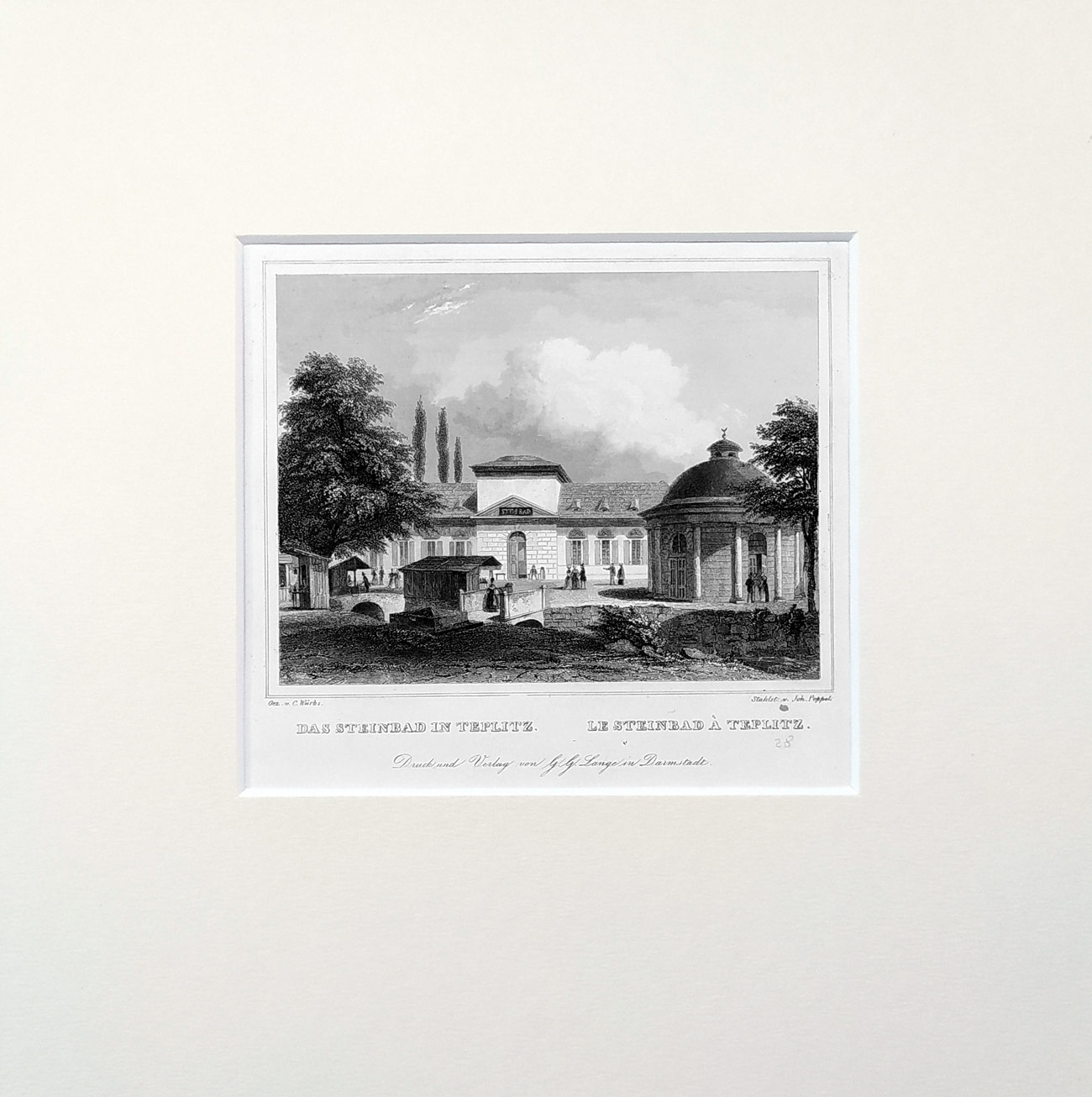 Teplice – Kamenné lázně. „Das Steinbad in Teplitz. Le Steinbad á Teplitz.“, původní oceloryt, 1845. Podle kresby Carla Würbse vyryl Johann Poppel. Vydal: Vydal Ludwig Lange v Darmstadtu.