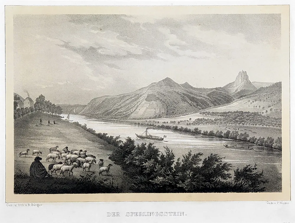 Vrabinec hrad. „Der Sperlingsstein“. Původní litografie. Podle vlastní kresby litografoval R. Bürger. Celkový rozměr v paspartě 32,0 cm × 36,5 cm.