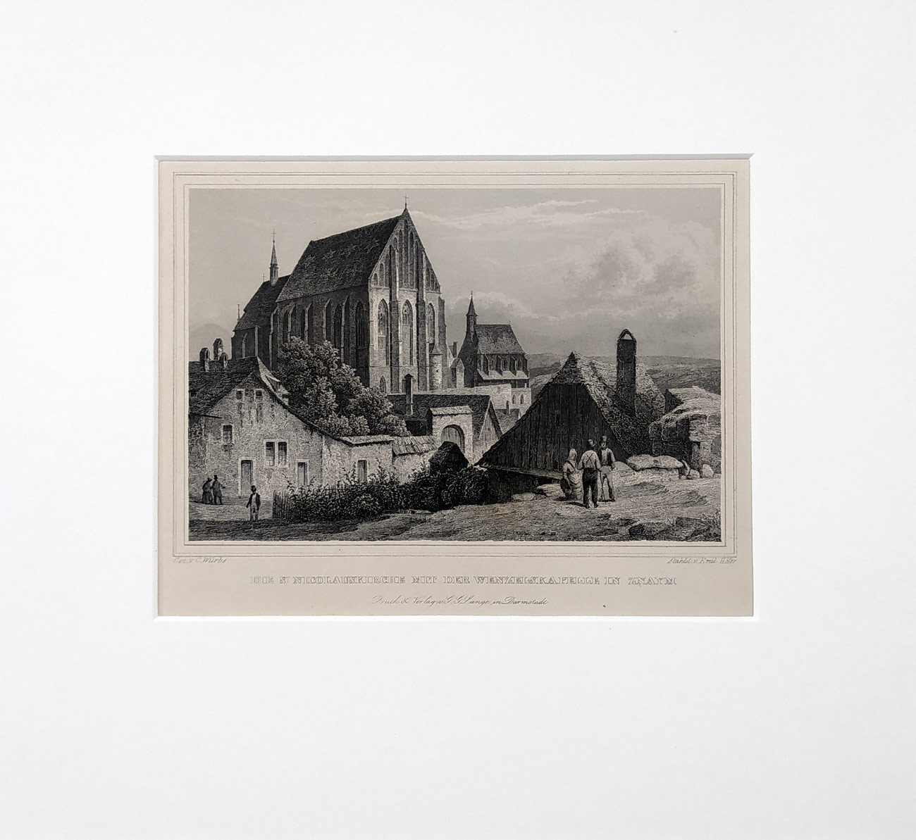 Znojmo – Kostel sv. Mikuláše a Kaple sv. Václava, C. Würbs, E. Höfer, pův. oceloryt, ca 1840. Pod vyobrazením název listu: „Die St. Nicolauskirche mit der Wenzelskappele in Znaym“. Celkový rozměr v paspartě: 25,5 cm × 28,8 cm.