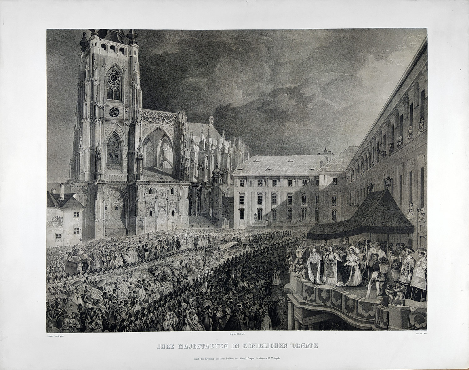 Praha – Císař Ferdinand I. s císařovnou Marií Annou na Pražském hradě, Gurk, Herr, původní litografie, 1836. „Jhre Majestaeten im Königlichen Ornate nach der Krönung auf dem Balkon des königl. Prager Schlosses 12ten Septbr.“ Podle E. Gurkovy kresby litografoval Faustin Herr. Tiskl J. Höfelich ve Vídni, 1836.