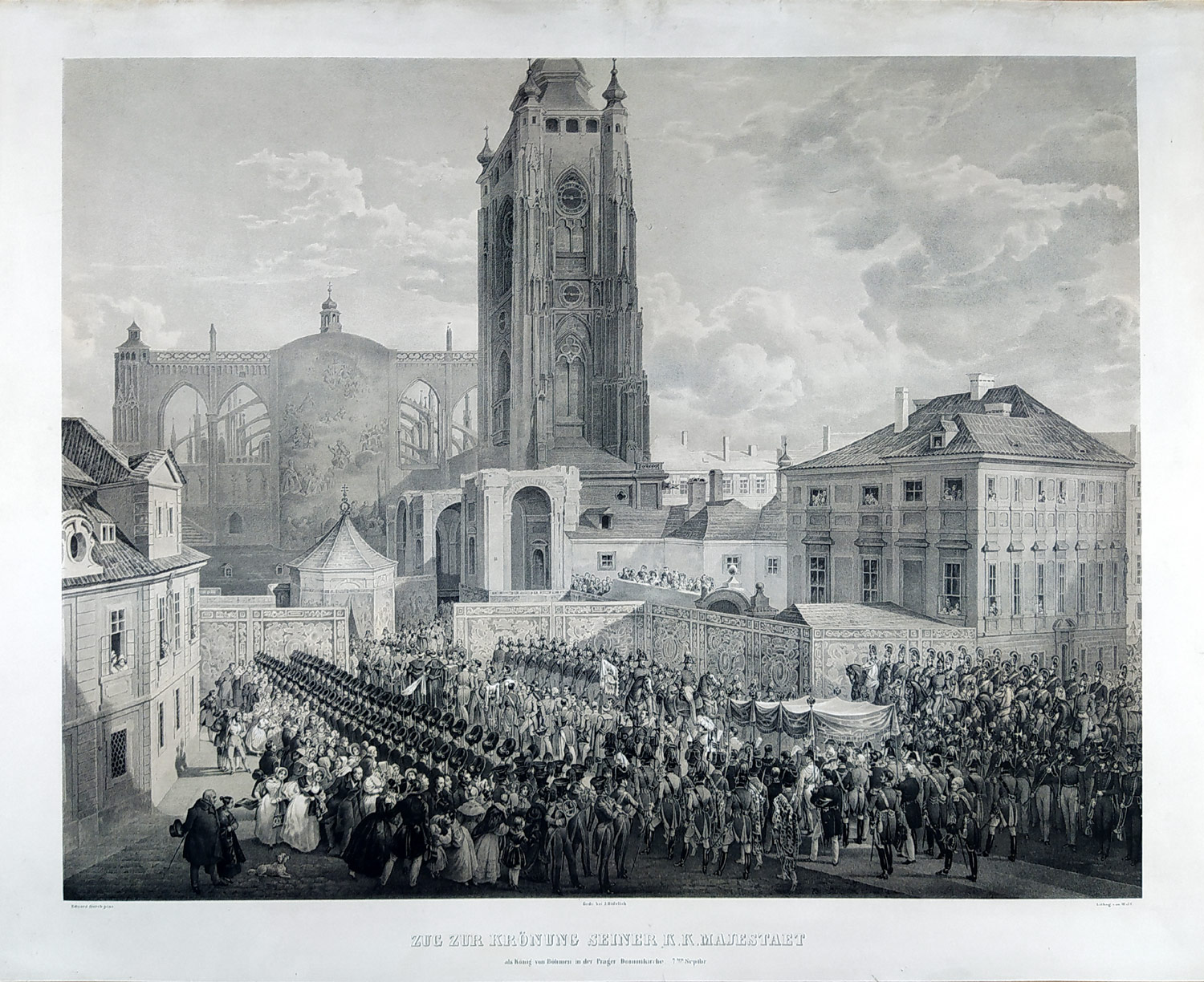 Praha – Korunovační průvod na Pražském hradě. „Zug zur Krönung seiner K. K. Majestaet als König von Böhmen in der Prager Domkirche. 7ten Septbr.“ Původní litografie. Podle E. Gurkovy kresby litografoval Wolf. Tiskl J. Höfelich ve Vídni, 1836.