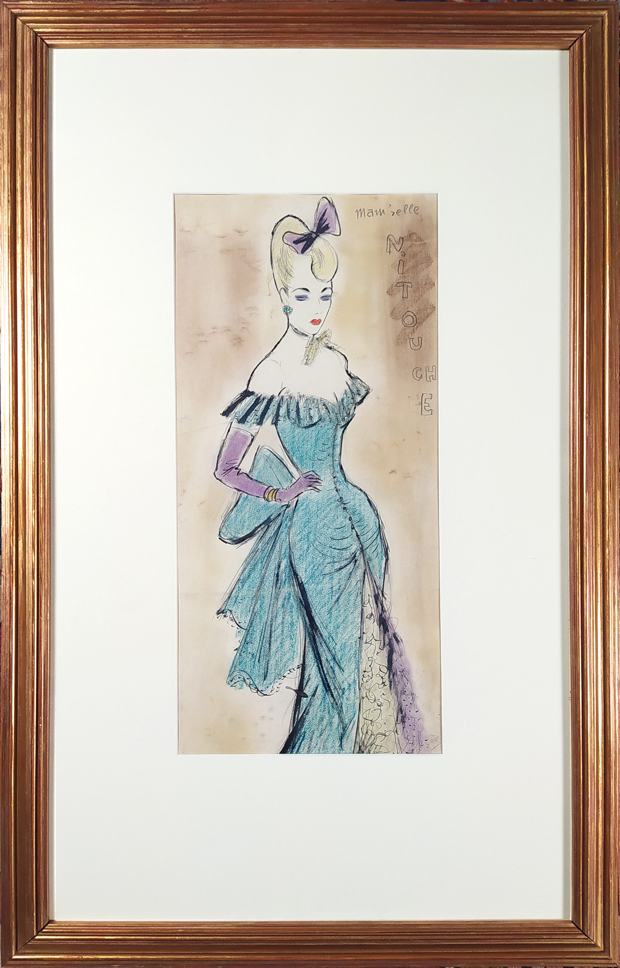 Veris Jaroslav / Zamazal – Corinna, primadona z operety Mam'zelle Nitouche, malba, kombinovaná technika, akvarel, tuš, pastel, 1938. Výtvarná technika odpovídá tehdejšímu Verisovu „pařížskému“ stylu, který kladl důraz na ženskou eleganci a šarm.