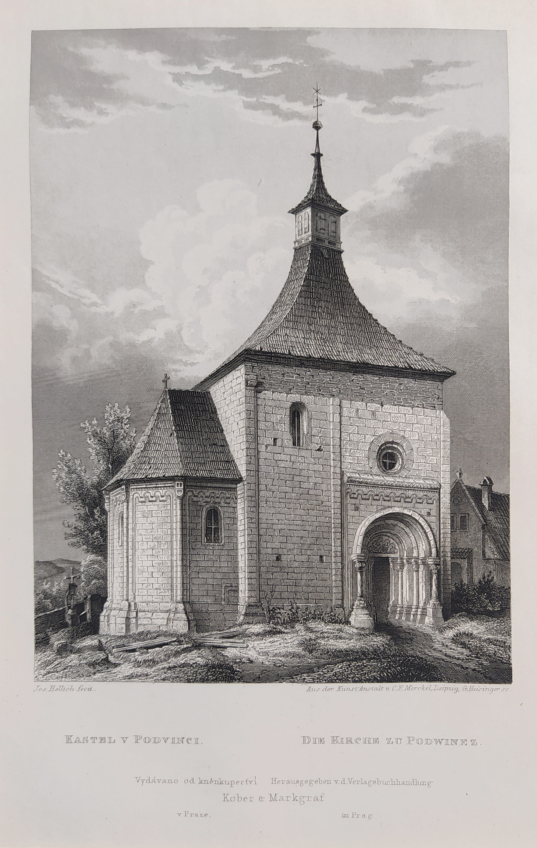 Vinec – Kostel sv. Mikuláše. Pod vyobrazením dvoujazyčný název listu: „Kostel v Podvinci. Die Kirche zu Podwinez“. Podle kresebné předlohy J. V. Hellicha vyryl G. Heisinger. Vydal I. L. Kober v Praze, 1860. Celkový rozměr v muzeální paspartě: 34,5 cm × 26,1 cm.