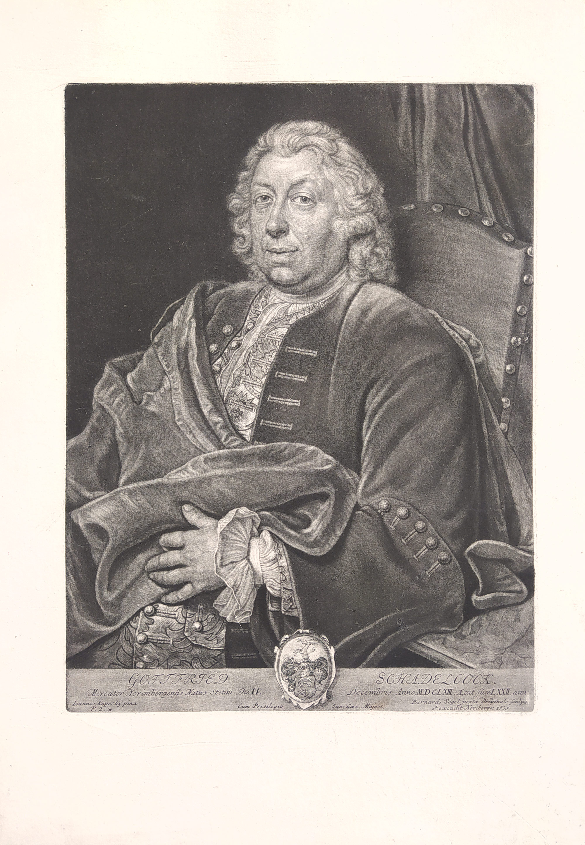 Vogel Bernhard – Gottfried Schadeloock, portrét podle Jana Kupeckého, původní mezzotinta, 1735. Podle olejomalby Jana Kupeckého vyryl Bernhard Vogel, vytištěno v Norimberce 1735. Celkový rozměr: 47,2 cm × 32,4 cm.