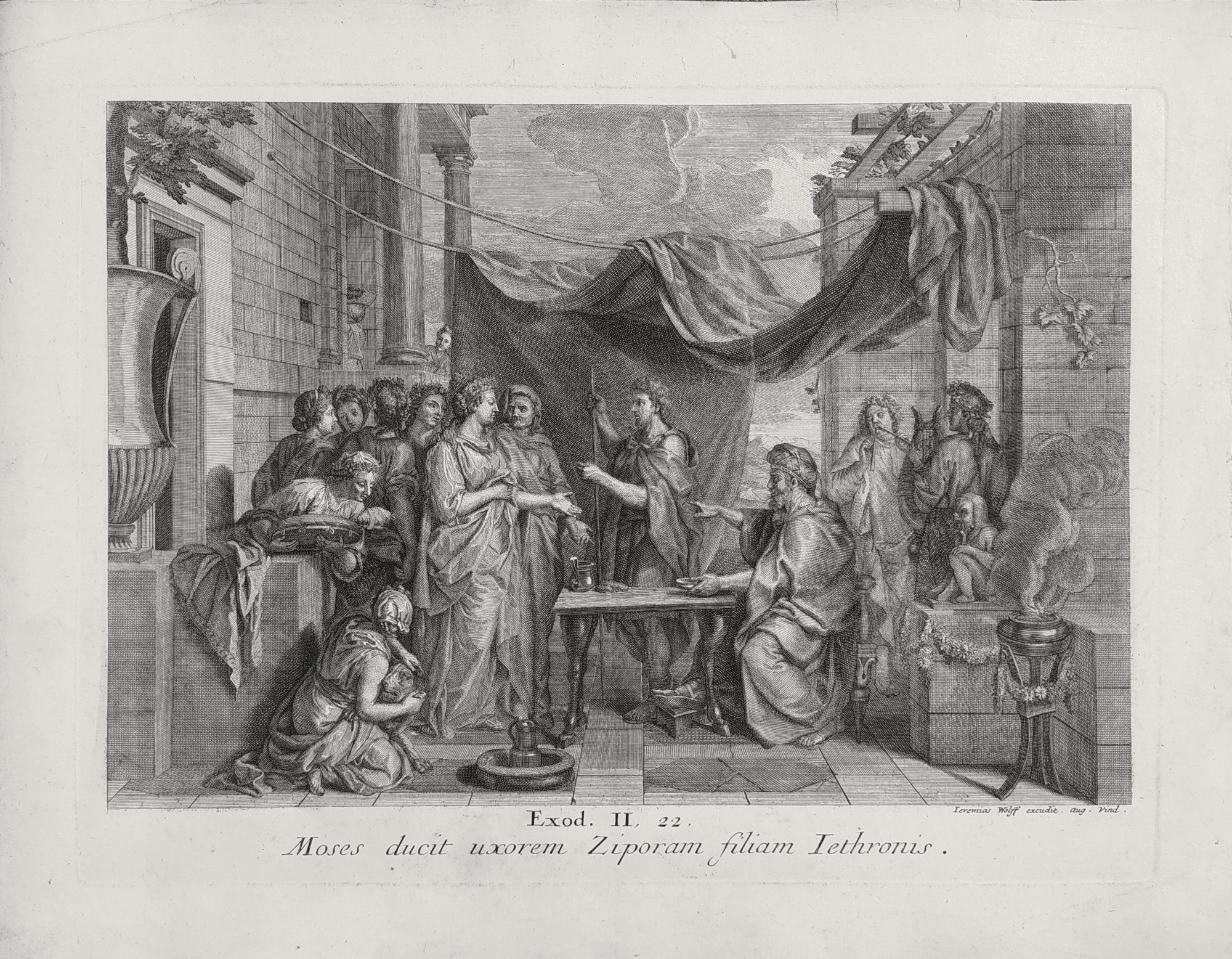 Wolff Jeremias – Mojžíš si bere Zeforu, mědiryt, ca 1690. Pod vyobrazením nápis: „Exod. II, 22. Moses ducit uxorem Ziporam filiam Iethronis.“. Vydal Jeremias Wolff v Augsburgu. Celkový rozměr: 32,4 cm × 43,1 cm.